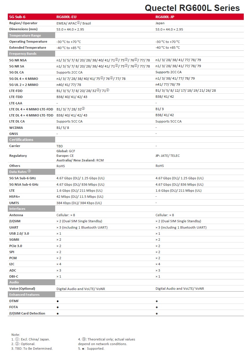 RG600L-EU is a 5G Sub-6 GHz LGA module optimized specially for IoT and eMBB applications. By adopting the 3GPP Rel-15 technology, the module supports both 5G NSA and SA modes. RG600L-EU is an industrial-grade module for industrial and commercial applications only.