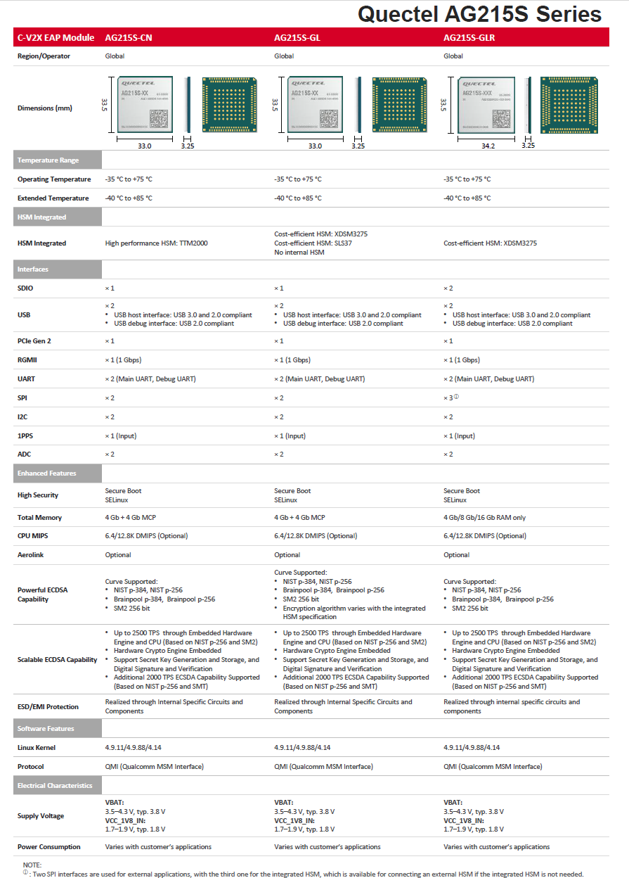 The AG215S is an automotive grade application processor module for C-V2X and telematics applications in an LGA form factor which measures 33.0mm × 33.5mm × 3.30mm and weighs 7.07g. Featuring a 1.4 GHz dual-core processor (and optional quad-core processor) with 64-bit ARM Cortex-A53 microprocessor cores and dedicated AP for ITS stack and applications, the AG215S is optimized for performance with Quectel’s automotive modules AG15, AG520R, and AG550Q.