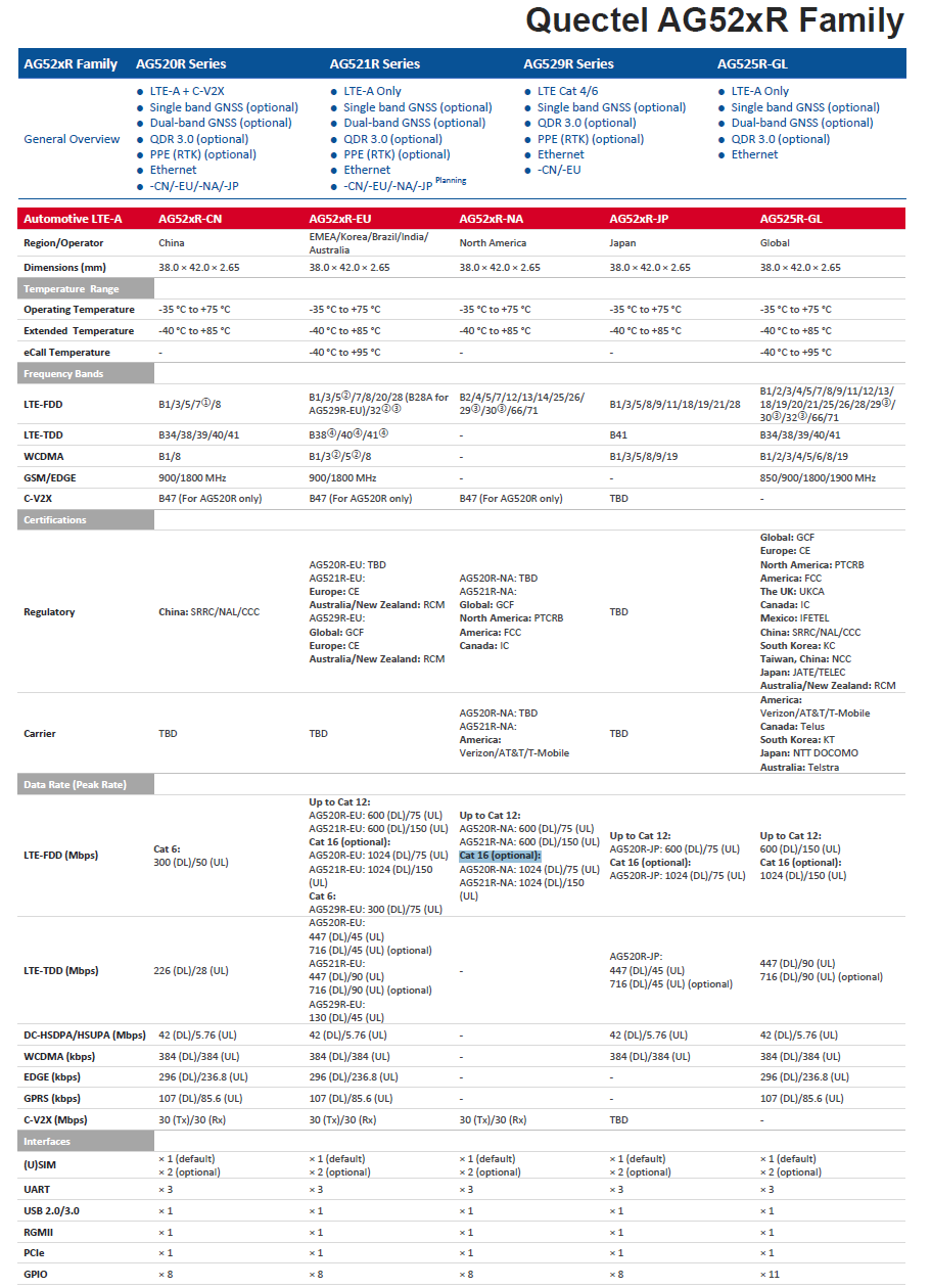 AG52xR family consists of AG520R series (LTE-A + C-V2X), AG521R series (LTE-A only), AG529R series (LTE Cat 4/6) and AG525R-GL (LTE-A only) variants, which contains multiple models to meet market demands. It is backward compatible with existing UMTS and GSM networks, enabling it to be connected even in remote areas devoid of 4G coverage.