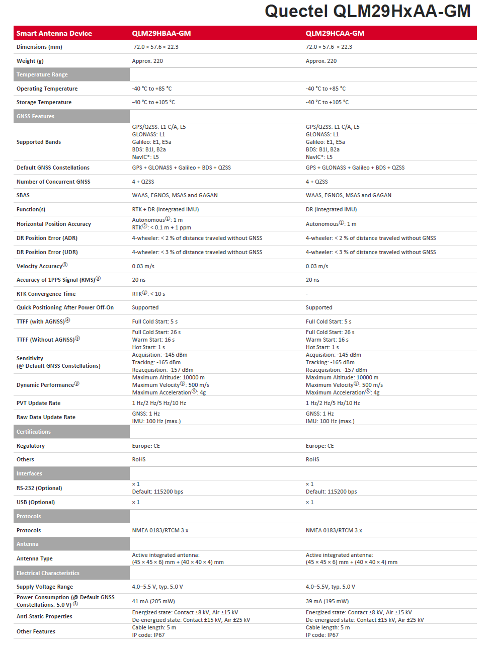 QLM29HxAA-GM (QLM29HBAA-GM and QLM29HCAA-GM) is a dual-band multi-constellation smart antenna device with a built-in Quectel dual-band high-precision LC29H module and L1 + L5 high-performance ceramic dual-band antennas. Concurrent reception of L1 and L5 GNSS band signals enhances satellite visibility, reduces multipath interference, and improves positioning accuracy of QLM29HxAA-GM, even in challenging environments like urban canyons, while its plug-and-play design eliminates the need for onboard integration.