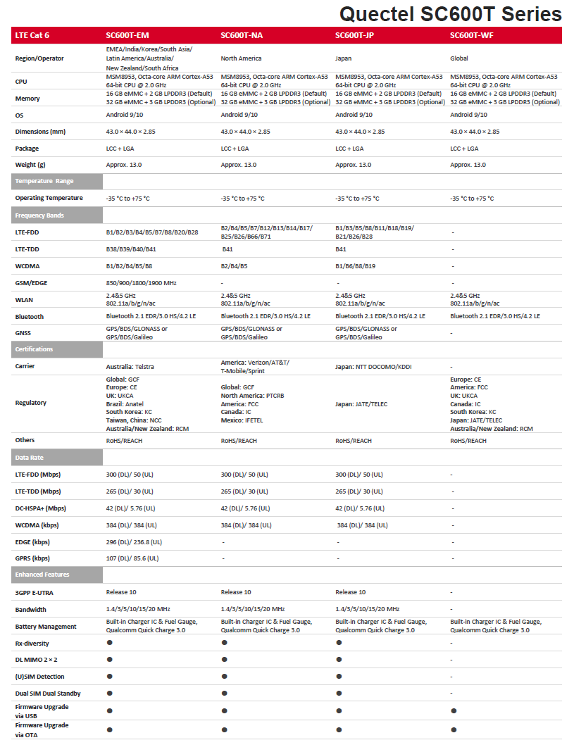 The SC600T is a series of new-generation multi-mode LTE Cat 6 smart IoT modules measuring 43.0mm × 44.0mm × 2.85mm with built-in Android OS, based on Qualcomm’s ARM Cortex-A53 64-bit octa-core processor, and built-in Adreno 506 GPU. This high-performance module supports various multimedia features and Quick Charge 3.0 technology, making it ideal for both industrial and consumer applications that require high data rates. The SC600T consists of four variants to meet various geographical demands, which can be compared via the table above.