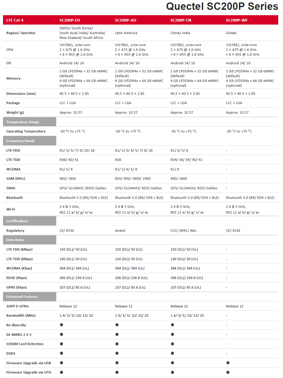 SC200P is a series of Quectel’s new generation of multi-mode smart LTE Cat 4 modules with built-in Android OS. Based on UIS7861 dual-core ARM Cortex-A75 processor and hexa-core ARM Cortex-A55 processor with built-in ARM Mali-G57 GPU, it is an ideal solution for a wide range of industrial and consumer applications requiring high data rates and multimedia functions. SC200P series module has four variants: SC200P-EU, SC200P-AU, SC200P-CN and SC200P-WF (only supports Wi-Fi & Bluetooth antenna).