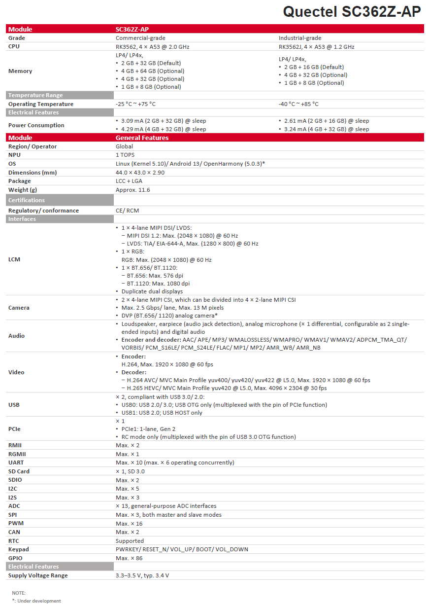 The SC362Z-AP is Quectel’s new generation smart module, with an embedded Linux/ Android operating system. The module integrates Rockchip IoT chip RK3562/ RK3562J. Based on high-performance quad-core ARM Cortex-A53 CPU, ARM Mali G52 GPU, 13 M ISP HDR, 1 TOPS NPU as well as supporting external Wi-Fi and Bluetooth, the module is ideal for industrial applications requiring automation and consumer applications requiring high data rate and multimedia functions.