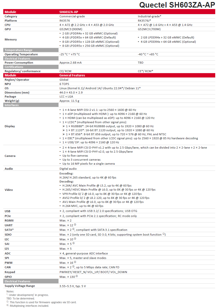 The SH603ZA-AP is Quectel’s new generation of smart module, integrating Rockchip IoT chip RK3576/ RK3576J, including high-performance 4 x ARM Cortex-A72 + 4 x ARM Cortex-A53 CPU, ARM Mali G52 MC3 GPU, 16 M ISP HDR and 6 TOPS NPU computing power. Supporting external Wi-Fi, Bluetooth and EBC, the module is ideal for industrial applications requiring automation, as well as consumer applications requiring high computing power and multimedia functions.