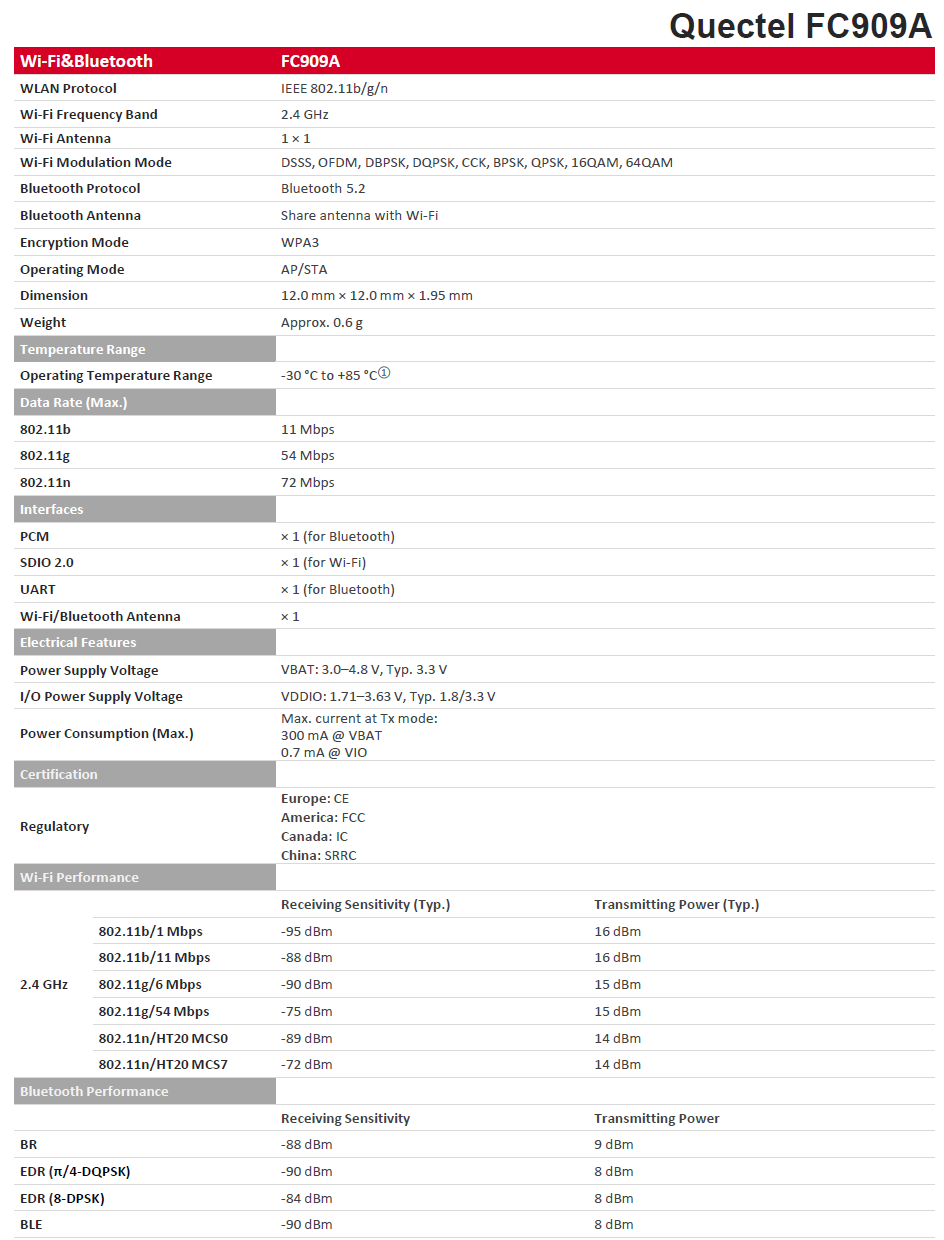 FC909A is a Bluetooth 5.2 compliant module. The Bluetooth transmitter also features a Class 1 power amplifier. FC909A supports extended Synchronous Connection Oriented link (eSCO) for enhanced voice quality by allowing for retransmission of dropped packets and Adaptive Frequency Hopping (AFH) for reducing radio frequency interference.