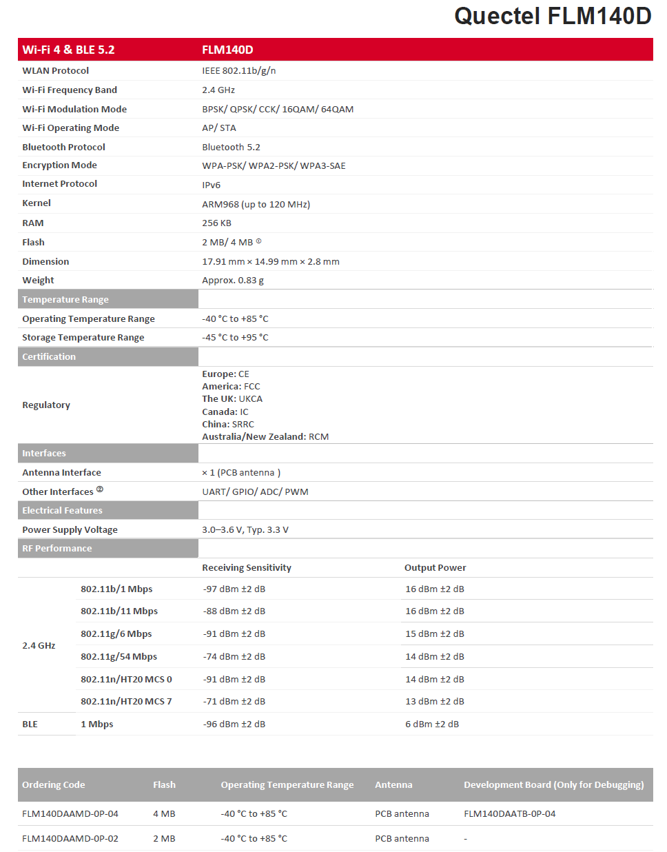 FLM140D is a cutting-edge MCU Wi-Fi and Bluetooth module launched by Quectel. It boasts a high-performance processor with a frequency of up to 120MHz and supports IEEE 802.11b/g/n protocol and BLE 5.2. The module features built-in 256KB RAM, 2MB or 4MB flash, ensuring efficient performance. In addition, it complies with WPA-PSK, WPA2-PSK and WPA3-SAE security standards.